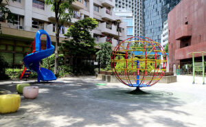 「こどものひろば公園」は、“東京100年記念祭事業”の一環として小学生たちが考えた理想郷が実現した場所です。カラフルな団地風の遊具がリニューアルされ、安全性も強化されました。