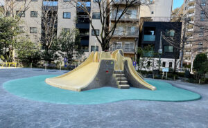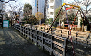 神田明神の隣に佇む宮本公園は、歴史と自然が調和した穏やかな空間です。傾斜を利用した滑り台+アスレチックがメインの遊具エリアは、子供たちの元気な遊び場として親しまれています。