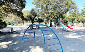 姫森公園はコンパクトなスペースの中、滑り台、ブランコ、鉄棒などがぎゅうぎゅうなのでパーゴラ+ベンチもコンパクト。