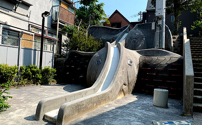 ゾウのすべり台は、この公園の高低差を生かすように設計されています。このような形態のすべり台は、新宿区の他の公園では見られないもので、あかぎ児童遊園を象徴する遊具となっています。(新宿区HP)