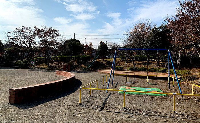 あかね台熊ノ谷公園、昔は芝生に熊がいましたが今は熊式滑り台が名残で主役遊具として熊が活躍しています。ほかにはレンガの壁風遊具やブランコで楽しめます。