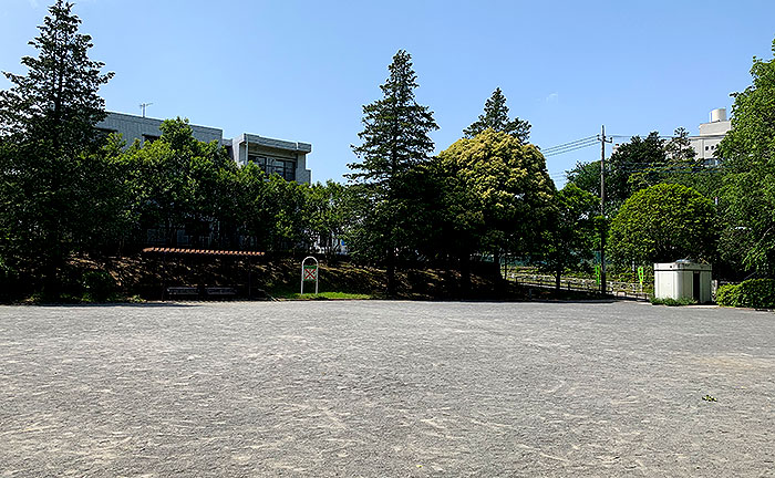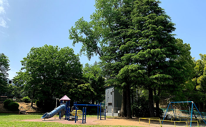 千草台のフラッグシップ公園、千草台公園は高い木に囲まれた緑いっぱいの公園です。真ん中に複合遊具、上のフロアにグラウンド、下のフロアにはプールがあります。
