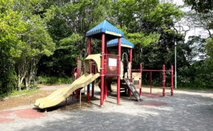 山口白山公園、なかなかベテランな滑り台、鉄棒だけがカラフルです