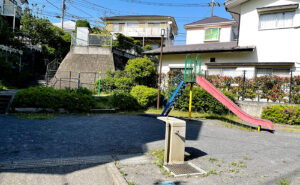 千代ヶ丘中ノ間東公園、滑り台、ブランコ、鉄棒、砂場と公園基本セットは全てあります