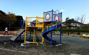 睦月公園の目玉は滑り台です。普通の滑り台、綱付き、石の滑り台と幅の広い滑り台で様々な遊び方ができます。少なくなってきている人研ぎ仕上げの滑り台が新しい街並みとのギャップがなかなか貴重です。