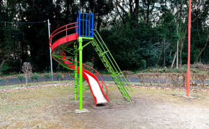 水の江公園は、自然の息吹を感じながら楽しめる魅力的な場所です。特徴的な赤いアクセントが施された長距離滑り台は、自然の中を疾走する興奮を味わえます。
