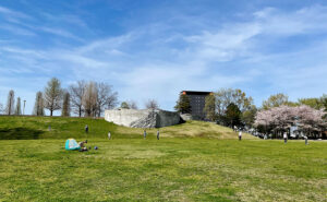 草深公園は、住まいの正面にあったなら日々の景色そのものを誇りにできる、公園の理想形のような場所である。 傾斜を描く芝生広場は、立っても座っても視線が自然に遠くへ伸び、街と空を同時に味わわせてくれる。