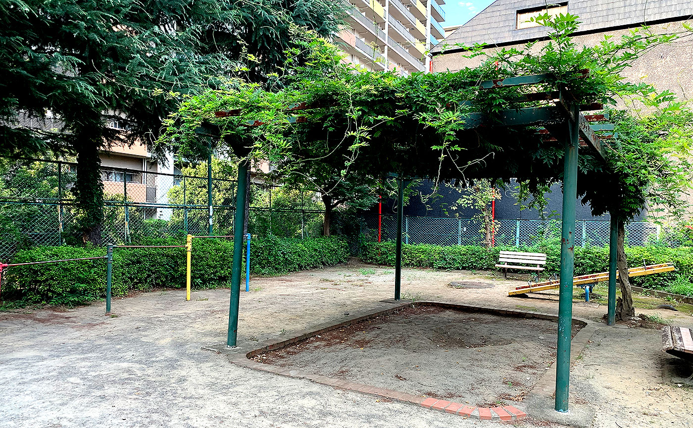 是政第三公園は、まるで小さな劇場のように遊具たちが配置された公園である。中央に鎮座するパーゴラは観客席のごとく、その周囲にはブランコ、シーソー、鉄棒が舞台の背景を飾る。