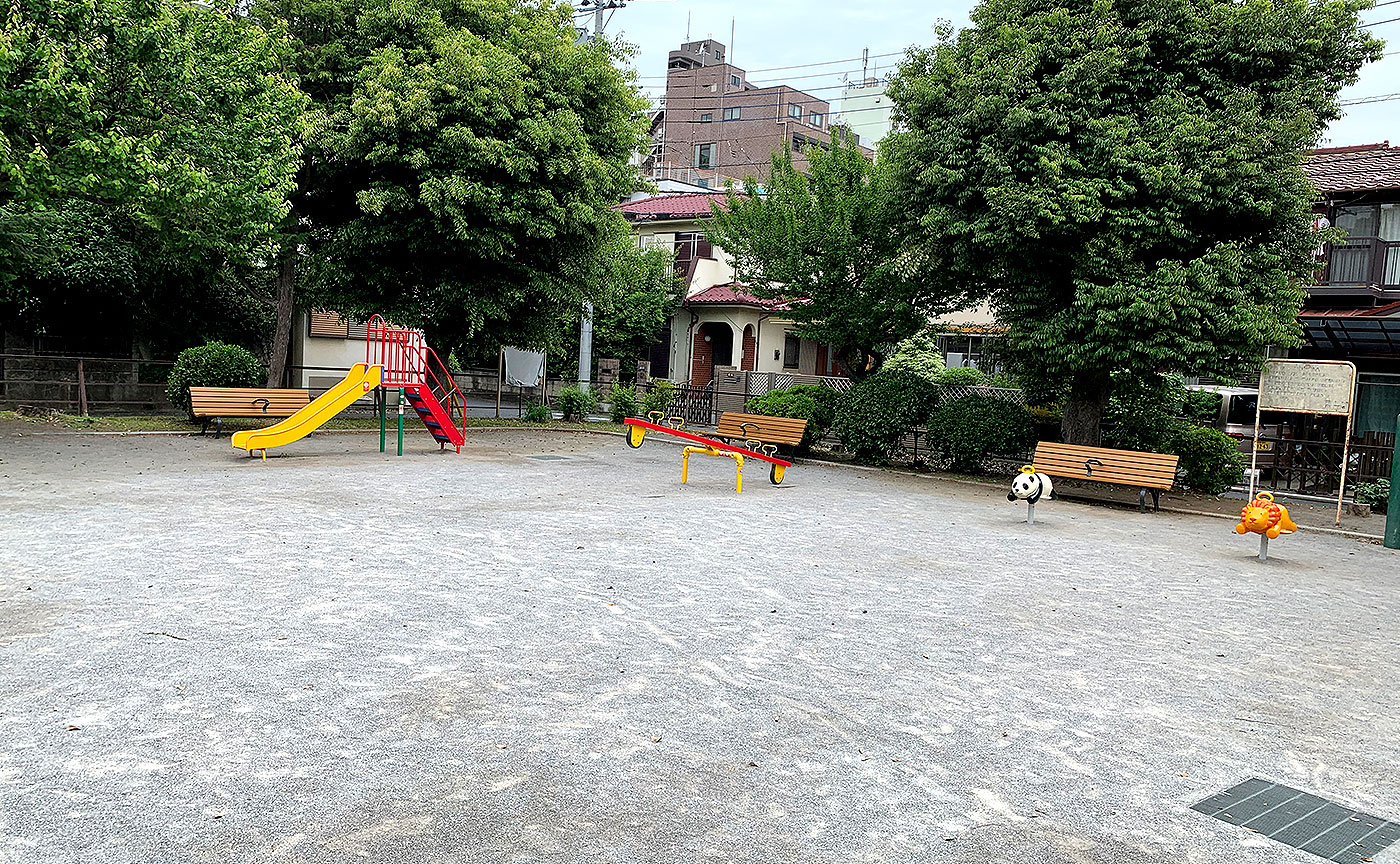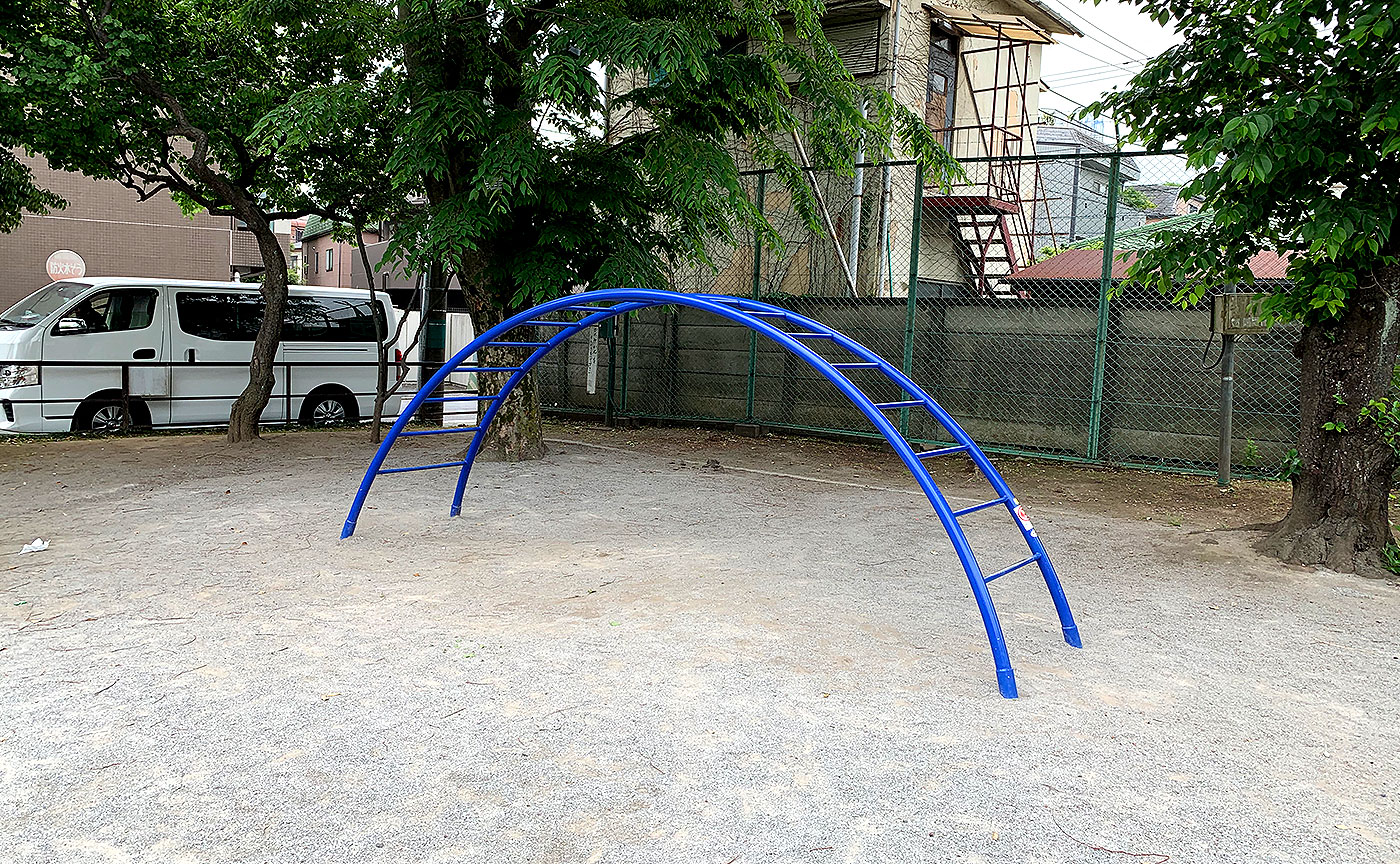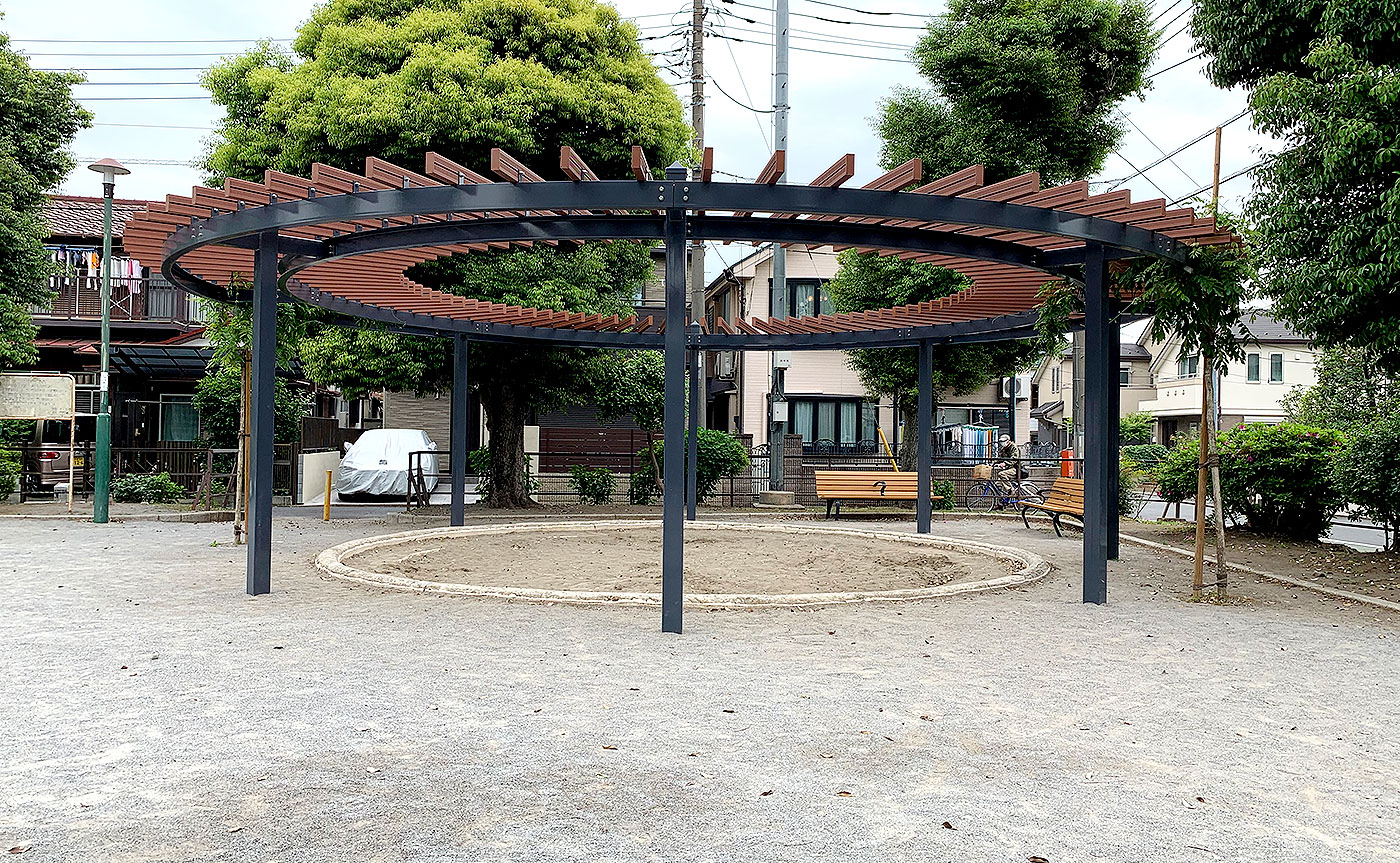 清水が丘公園に足を踏み入れると、まず目に飛び込んでくるのは、まるで異国の遺跡のようにそびえ立つ円形のパーゴラ。その堂々たる姿は、公園の守護者のごとく砂場を包み込み、ここで遊ぶ者たちを静かに見守っている。