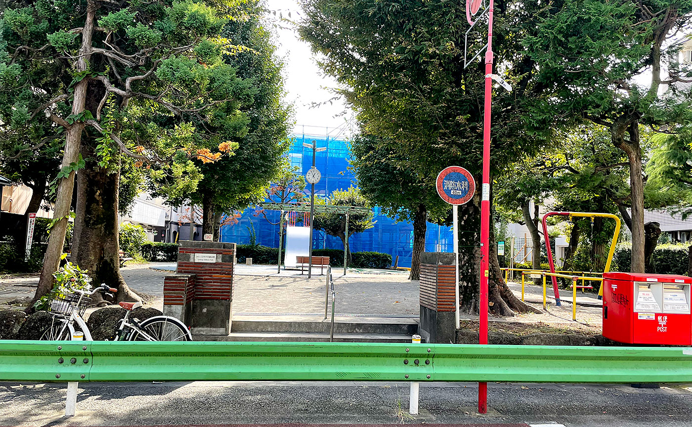 五本木児童遊園は、リニューアルを経ても変わらぬ魅力が広がる、親しみやすい公園です。広々とした滑り台が公園の中心に位置し、その前にはパーゴラ付きのベンチがあり、ゆったりと遊ぶ子どもたちを見守るのに最適な場所です。