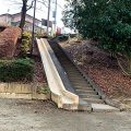 小宮上方あおぞら公園では複合遊具が楽しめます。そこから滑る側は先が細くなったスペースにな……