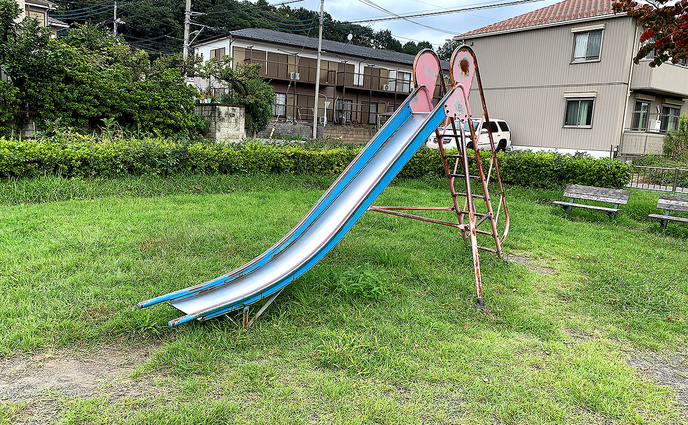 は広々とした公園です。遊具は隅っこに集め、そこでは滑り台やロッキンパッピーが楽しめます。