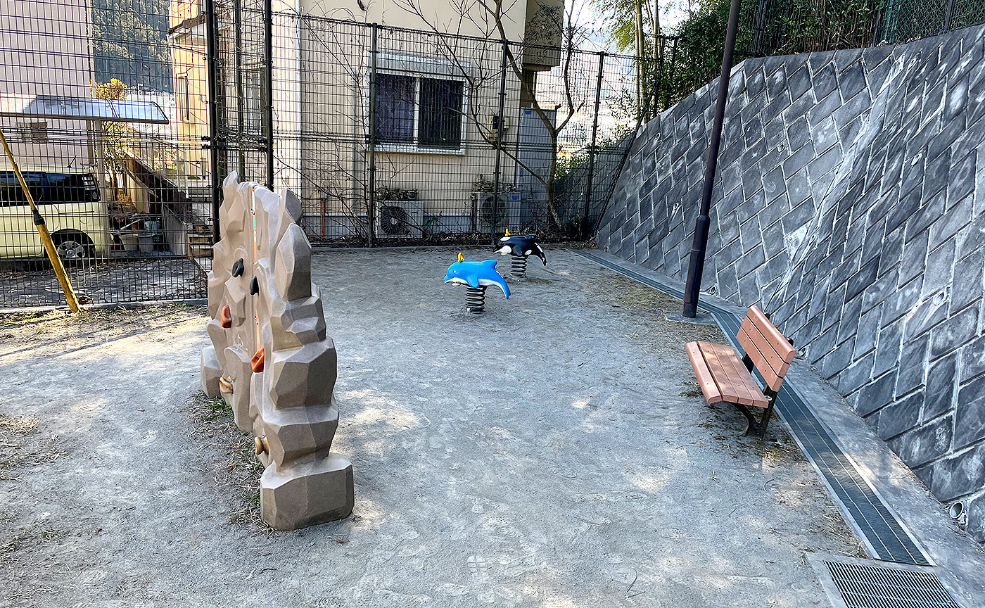 はど真ん中に天狗の石風のクライミング遊具が。その周りをイルカたちが泳ぎます。公園から出たところにはリアルな石があります。