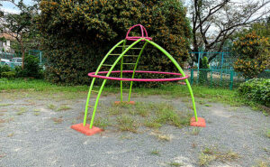 西片倉つつじ公園はメインの複合遊具のカラフルにそしてねじり具合に目が奪われます。周りのブランコが一歩下がったカラーリングがさらに映えさせているようです。
