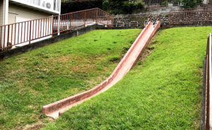 傾斜を活かした長い滑り台は、滑るというよりも、時の流れを滑空する装置のようである。