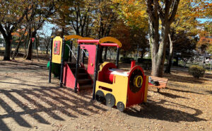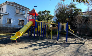 子安公園はカラフルな複合遊具が主役です。黄色がまぶしく裏には真っ赤な滑り台とテンションが上がりそうです。他にも小さなジャングルジム、滑り台などが楽しめます。