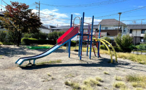 夾竹桃公園は滑り台、ブランコ、回転遊具が赤青黄色と元気なカラーリングでテンションを上げてくれます。
