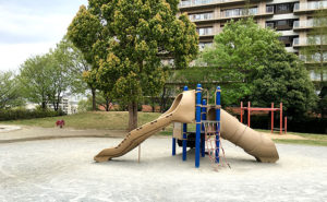 マンション前に広がる東谷公園はマンションの庭風のきれいな小さな丘を中心に遊具があります。