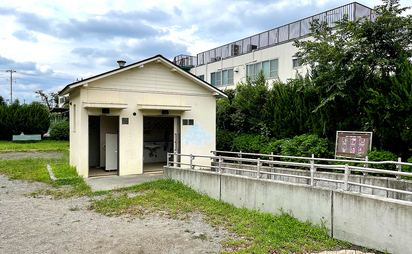 ではカラフルな複合遊具で楽しめます。その横には木風のいい感じのパーゴラ付き砂場でも楽しめます。奥に広いグラウンドがあるので、とてもしっかりしたトイレがあります。