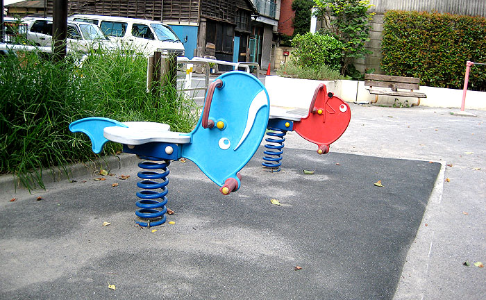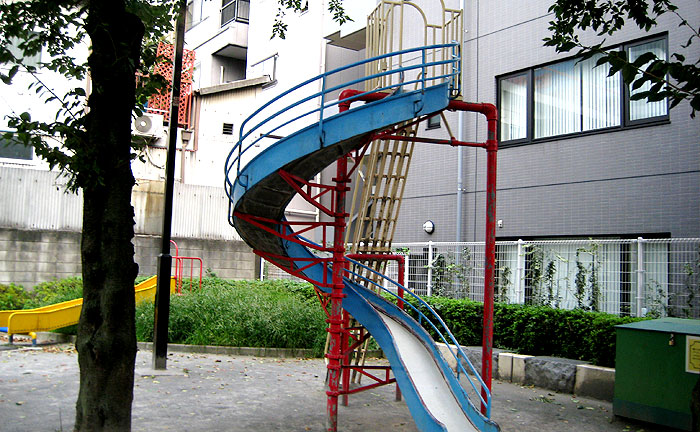 緑と赤のらせん型とローラー型の2種類のすべり台がある児童遊園です。鉄棒や砂場、スプリング遊具や広場もあるので、小さい子でも楽しめます。(荒川区HP)