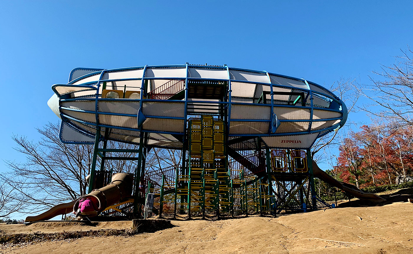 「ツェッぺリン号」は飛行船の形をしたジャングルジムです。市制60周年記念事業の一環として平成12年に登場しました。「ローラー滑り台」は平成10年に登場した全長約45メートルのなが~い滑り台です。意外とスピード感があります。前の人とぶつからないように気をつけて!(土浦市HP)