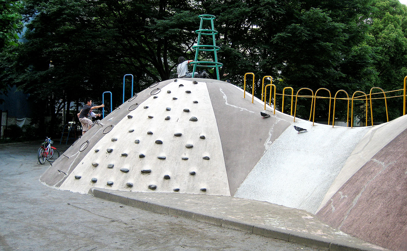 北谷端公園は、冒険心をくすぐるダイナミックな遊具が魅力です。大きな山が二つ並び、その間には吊り橋が架かっています。このユニークな設計により、公園登山を楽しむことができます。