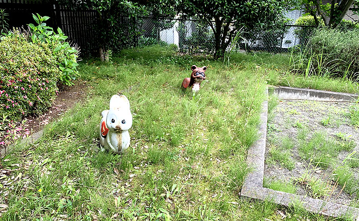 は庭を少し進んで階段を降りて着くというちょっと秘密の場所的な公園です。公園につくとウサギとたぬきがお出迎え、滑り台と砂場を楽しめます。