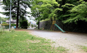 玉川学園やすらぎ公園は見た目以上に広い感じがします。高い木を周りに配し、片側は石の壁。