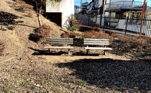 高ヶ坂わさび田公園は地面を芝生に覆われた公園です。砂遊びをじっと眺める用のベンチがあります。