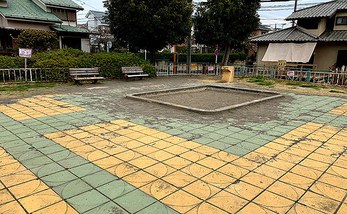 は昭和ではよくあったポップなタイルを敷いた明るい公園です。そこでは滑り台、砂場、ブランコ、シーソー、回転遊具とベーシックな遊具が勢揃いします。