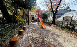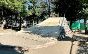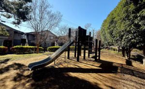 清水坂公園は、武蔵野台地の自然の恵みを活かした、高低差のある公園です。目玉は傾斜を利用したダイナミックなローラーコースター。スリリングな滑りを楽しめるこの遊具は、子どもたちに大人気です。