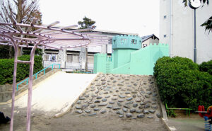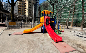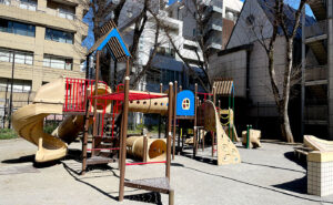 「こどものひろば公園」は、“東京100年記念祭事業”の一環として小学生たちが考えた理想郷が実現した場所です。カラフルな団地風の遊具がリニューアルされ、安全性も強化されました。