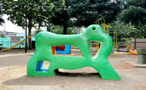 千住旭公園では、独特な山型遊具が目を引きます。その模様には何やら不思議な感じが漂いますが、近づいてみると子供たちが書いたイラストでした。