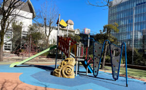 神田明神の隣に佇む宮本公園は、歴史と自然が調和した穏やかな空間です。傾斜を利用した滑り台+アスレチックがメインの遊具エリアは、子供たちの元気な遊び場として親しまれています。
