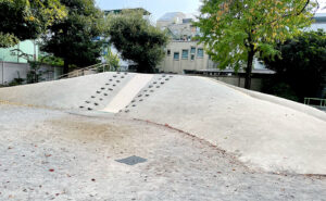 傾斜地に巧みに設置されたゲート風の遊具は、まるで秘密基地の入口。登れば展望台、滑れば冒険の始まり。