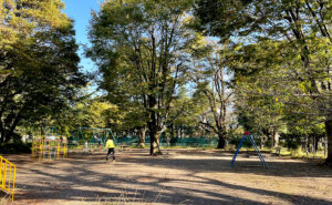 金森わさび田児童公園は遊具がとても小さく見えるぐらいの大きな樹木に囲まれた公園です。