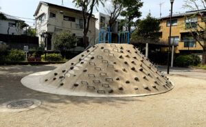 高円寺南公園は、ぎゅうぎゅうに詰まった住宅街のなかで、突如として現れる異空間。そこには驚くほどのスケール感をもつ山型遊具が悠然と鎮座し、砂場やブランコを従えている。