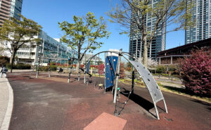 由来が気になる鉄砲洲児童公園、なんとなくその名にふさわしい、勇ましいアスレチックです。
