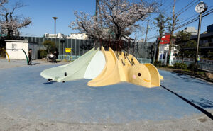 千住旭公園では、独特な山型遊具が目を引きます。その模様には何やら不思議な感じが漂いますが、近づいてみると子供たちが書いたイラストでした。