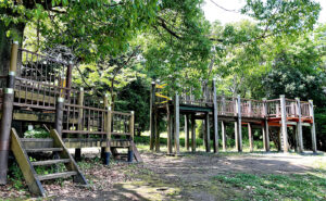 南長津田団地に囲まれた南長津田公園はイベントも開催されるグラウンド、そして高い遊具エリアでは滑り台や鉄棒で楽しめます。