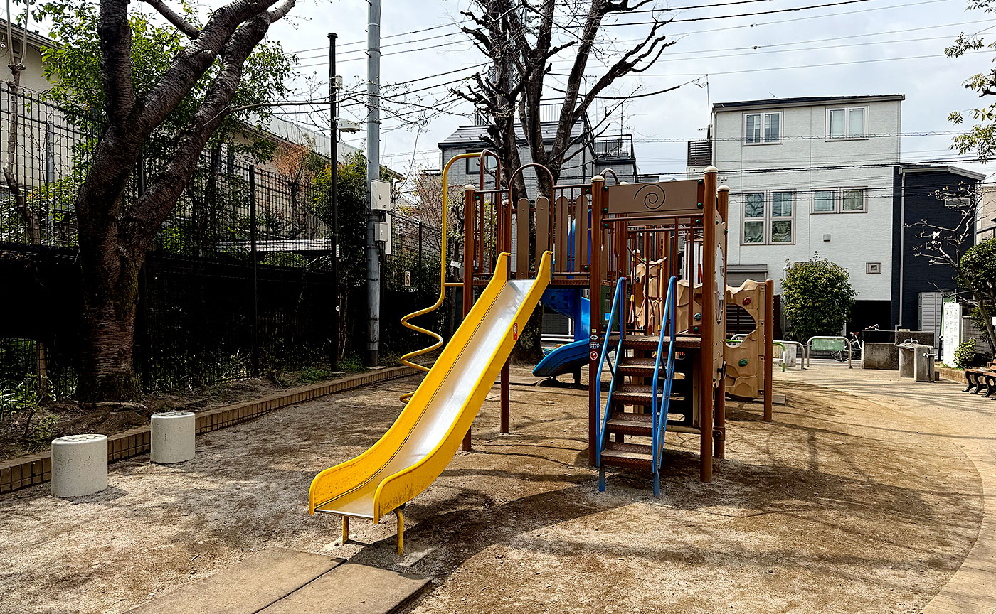 千駄木児童遊園は、まるで小さな要塞のような防火水槽に見守られながら、ひっそりと存在している。 入り口で軽く試される気分を味わった先には、色彩の理屈がきちんと編み込まれた複合遊具が待っている。