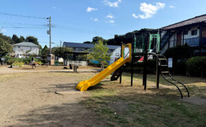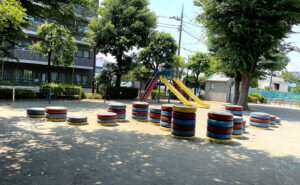 用賀一丁目公園はエッジの効いたベテラン砂場が楽しめます。そしてベテラン滑り台もあり落ち着いた空気を醸し出す空間です。