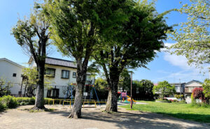 桜丘南公園は、喧騒を忘れ、大木たちと調和した環境でできます。