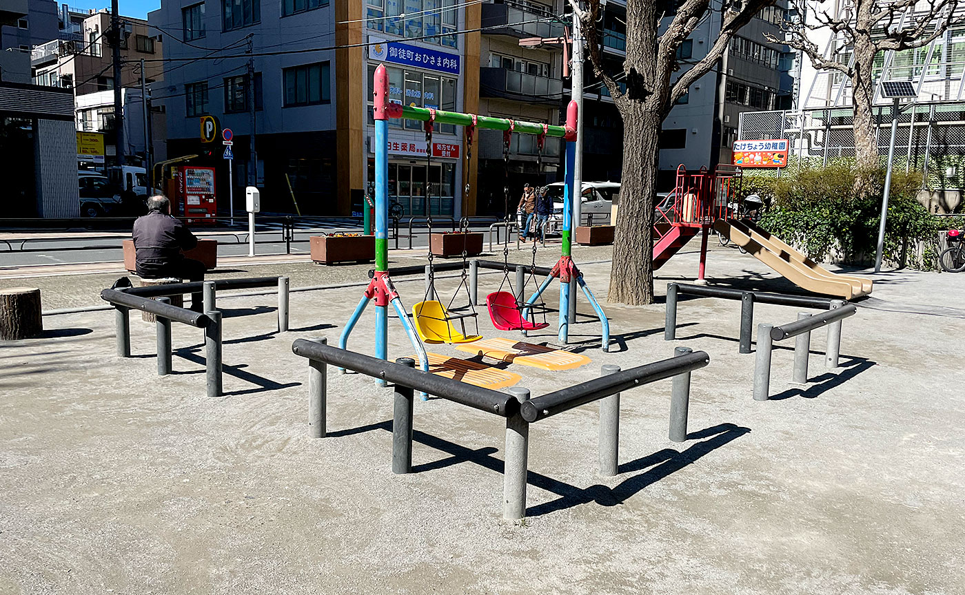竹町公園へようこそ。銀の玉のゲートが目印です。公園内では複合遊具やブランコを楽しむことができます。さらに、新幹線の3種類のスイング遊具もあり、子どもたちは大喜びです。