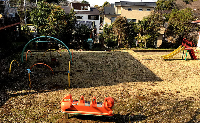 多摩市で一番東にある公園、東部児童公園。 ブランコはカラフルで丸いブランコ枠に 丸い柵でとてもポップな空間になっています。