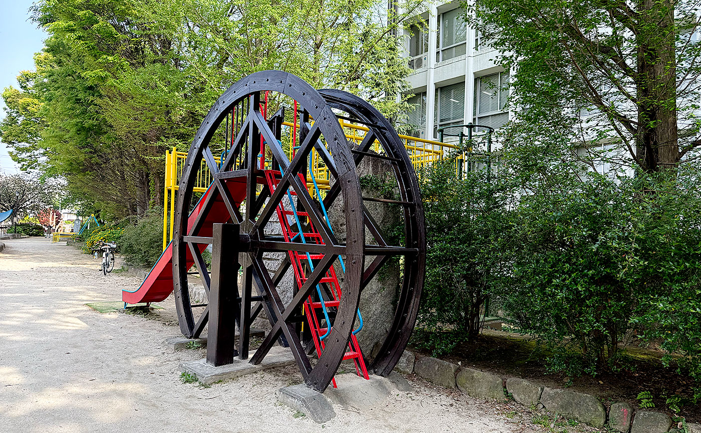 目玉はやはり水車。のどかに回りながら、時代の境を行き来している。梯子型の遊具は今や絶滅危惧種、都市から次々と姿を消す中で、ここにそれがあるという奇跡を見逃してはならない。