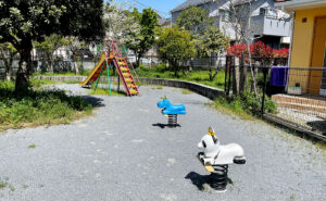 堀之内沖ノ谷戸公園は、地形を生かした美しい風景が広がる場所です。地形を活かして設置された滑り台やネット遊具は、子供たちにとって非常に楽しい遊び場です。