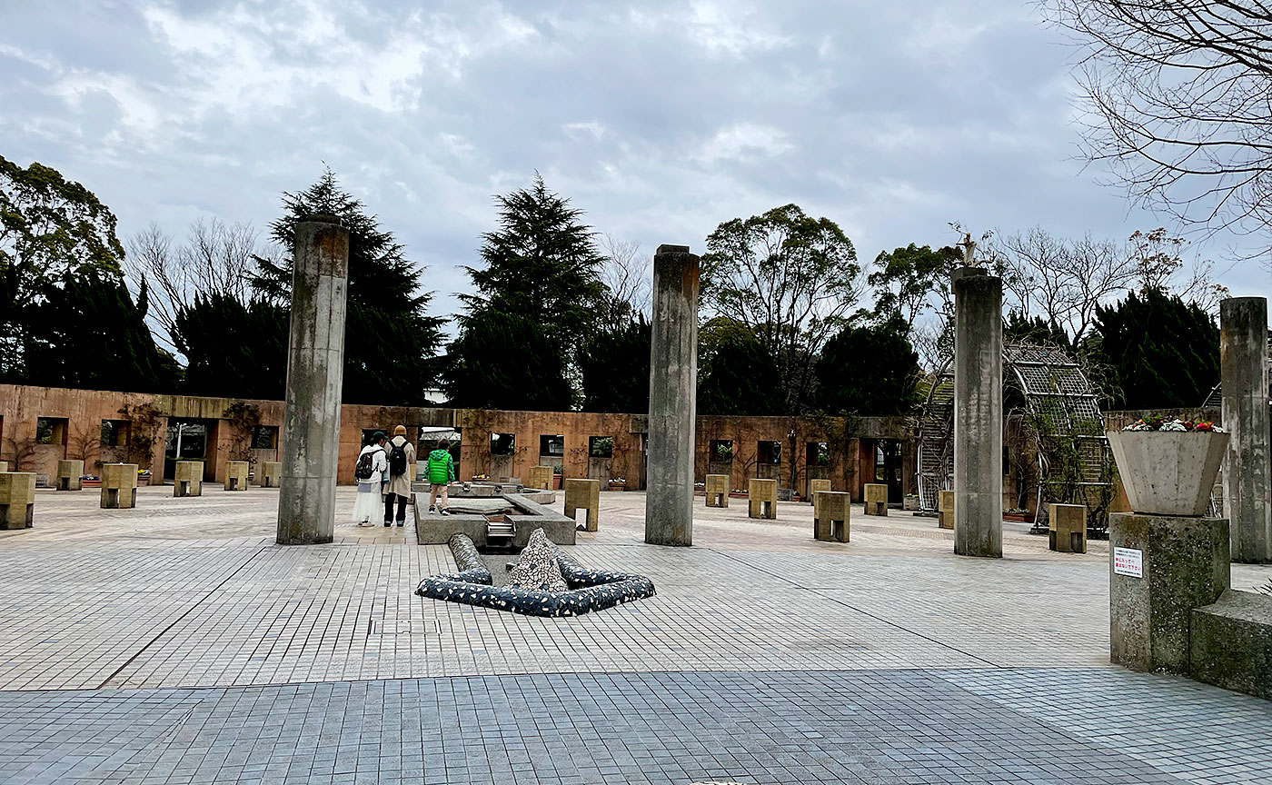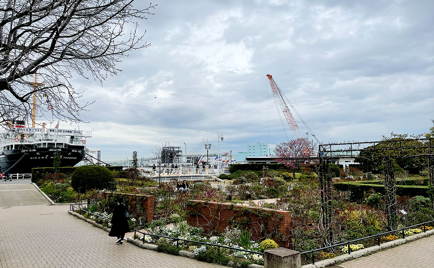 山下公園、中央には水の守護神が佇み、周囲には様々なテーマを持つ広場が広がります。せかいの広場やおまつり広場、そして広大な芝生広場が、訪れる人々に憩いの場を提供しています。 公園内には歴史的な碑も立ち並び、氷川丸やマリンタワーなどのランドマークが見えます。